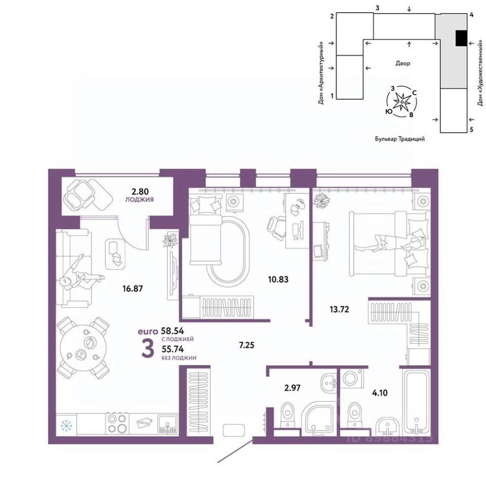Продается 3комнатная квартира на 5 этаже от застройщика Страна Девелопмент. Площадь квартиры 58,54 кв. м.