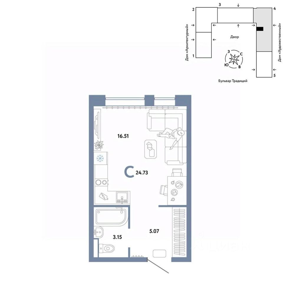 Продается 1комнатная квартира на 5 этаже от застройщика Страна Девелопмент. Площадь квартиры 24,73 кв. м.