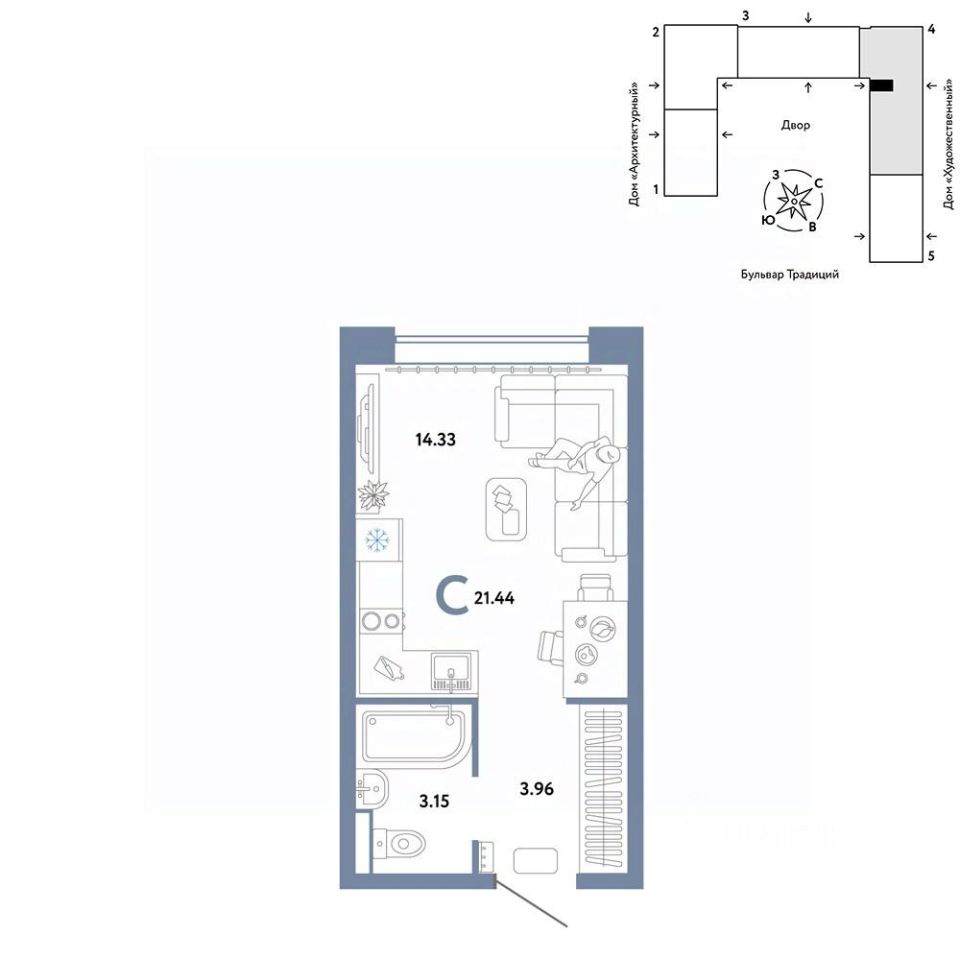 Продается 1комнатная квартира на 9 этаже от застройщика Страна Девелопмент. Площадь квартиры 21,44 кв. м.