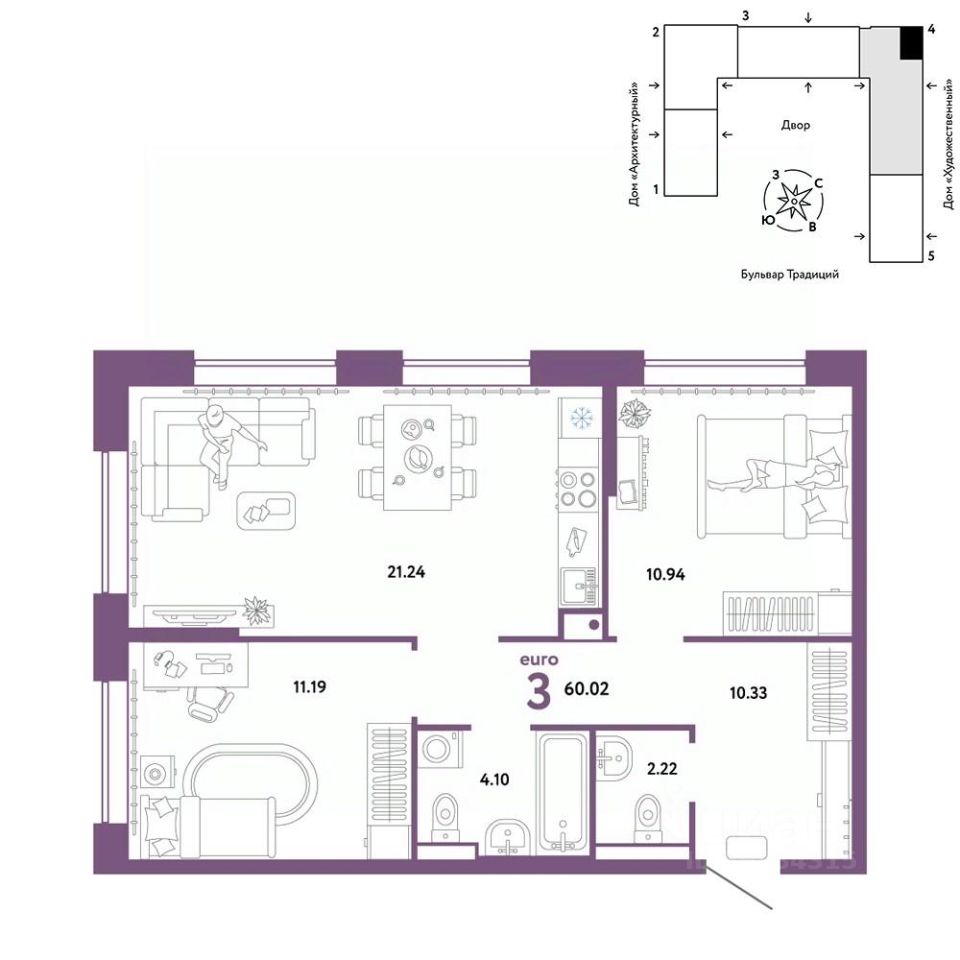 Продается 3комнатная квартира на 10 этаже от застройщика Страна Девелопмент. Площадь квартиры 60,02 кв. м.
