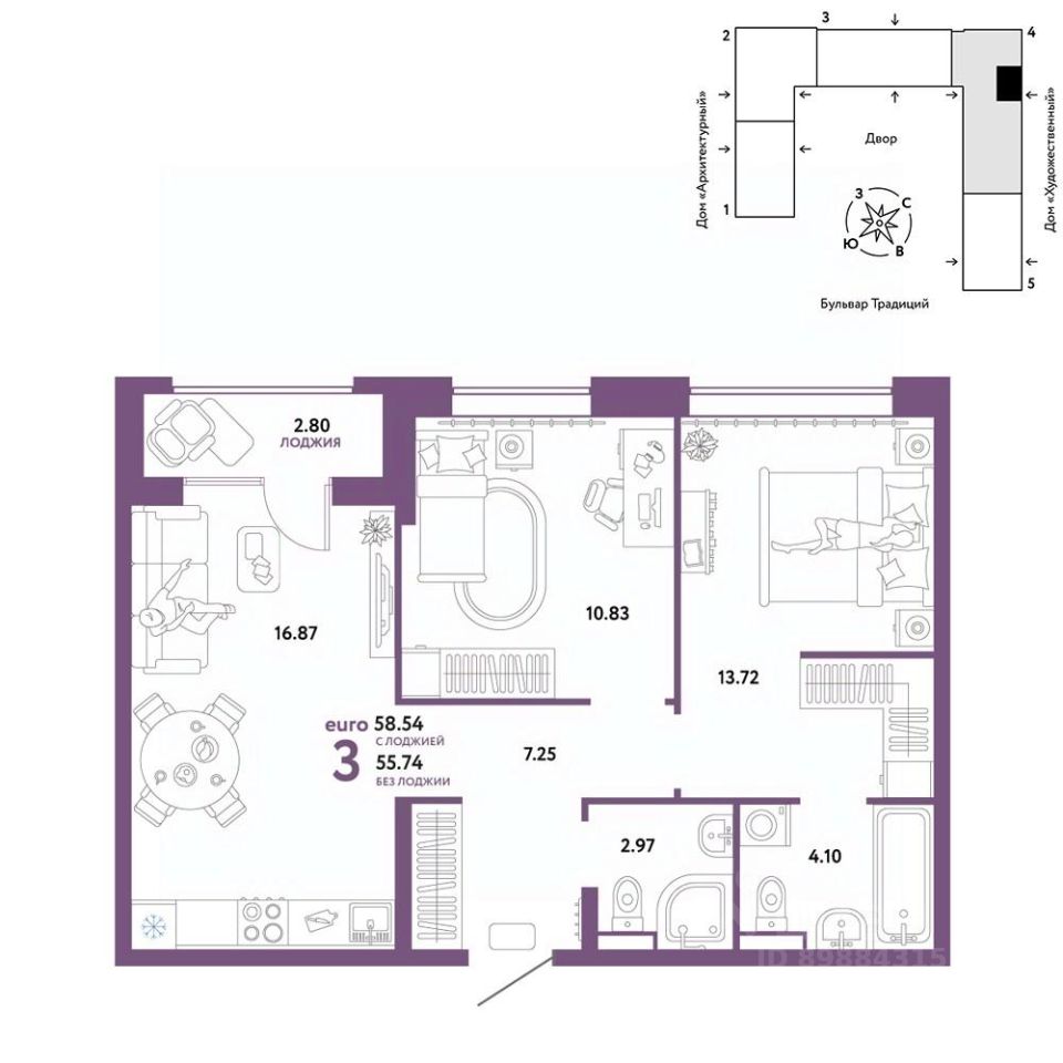 Продается 3комнатная квартира на 11 этаже от застройщика Страна Девелопмент. Площадь квартиры 58,54 кв. м.