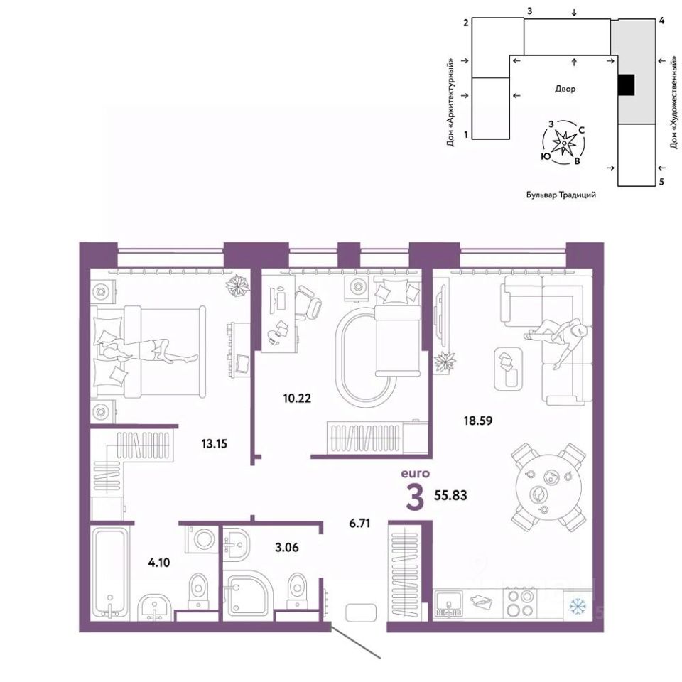 Продается 3комнатная квартира на 11 этаже от застройщика Страна Девелопмент. Площадь квартиры 55,83 кв. м.