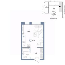 Продается 1комнатная квартира на 14 этаже от застройщика Страна Девелопмент. Площадь квартиры 24,73 кв. м.