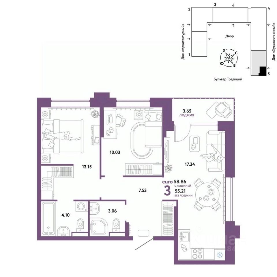 Продается 3комнатная квартира на 6 этаже от застройщика Страна Девелопмент. Площадь квартиры 58,86 кв. м.