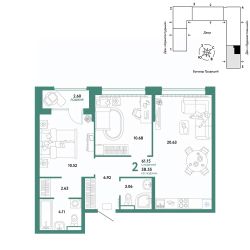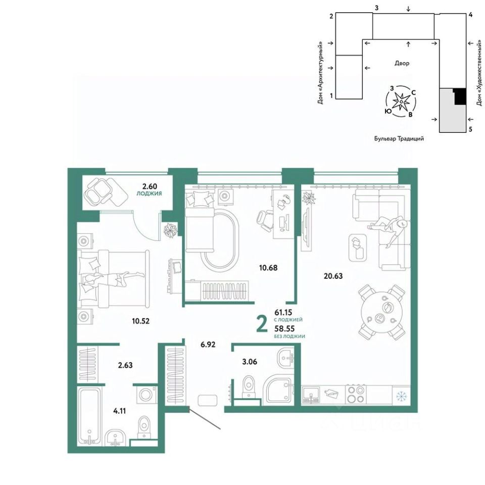Продается 2комнатная квартира на 7 этаже от застройщика Страна Девелопмент. Площадь квартиры 61,15 кв. м.