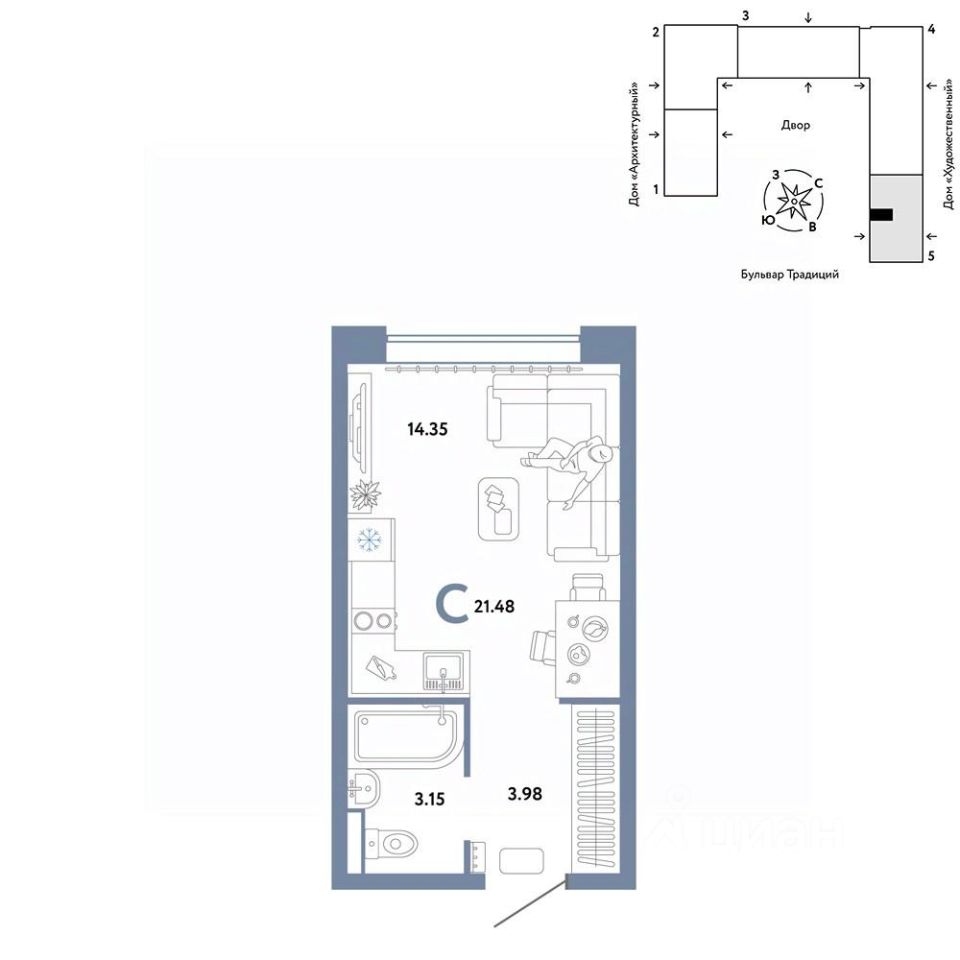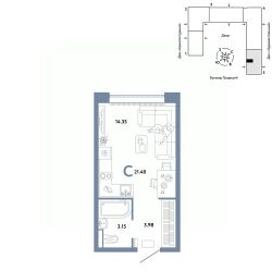 Продается 1комнатная квартира на 10 этаже от застройщика Страна Девелопмент. Площадь квартиры 21,48 кв. м.