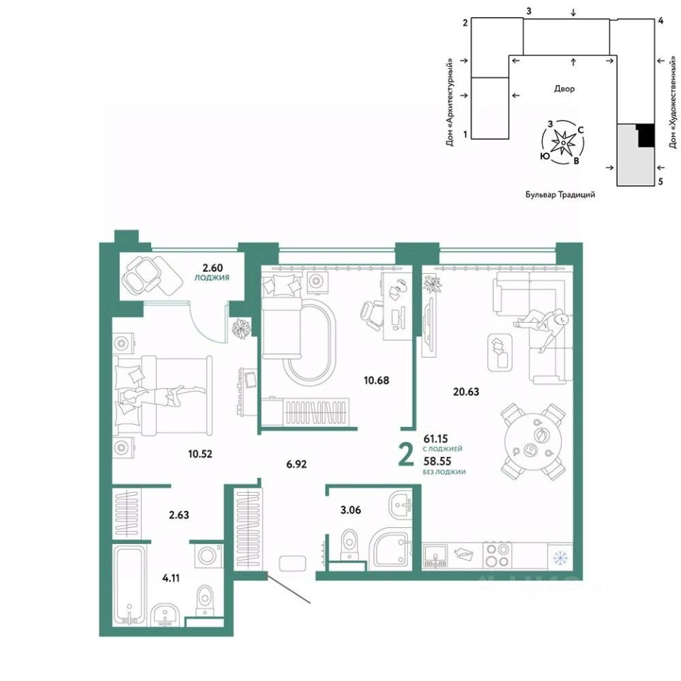 Продается 2комнатная квартира на 10 этаже от застройщика Страна Девелопмент. Площадь квартиры 61,15 кв. м.