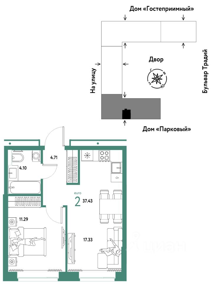 Продается 2комнатная квартира на 4 этаже от застройщика Страна Девелопмент. Площадь квартиры 37,43 кв. м.