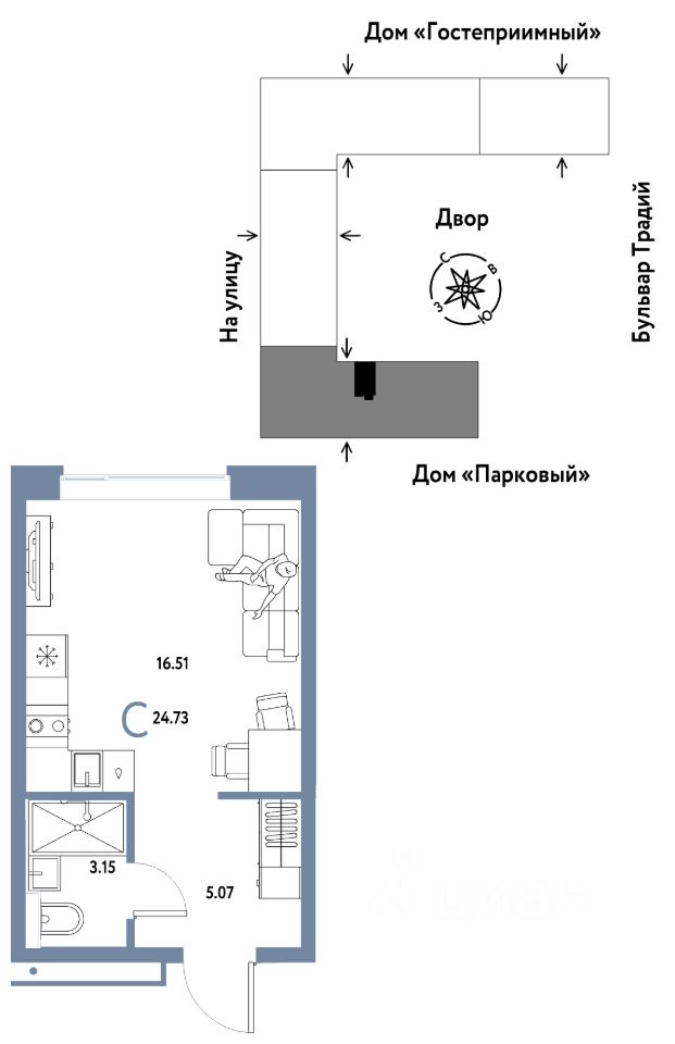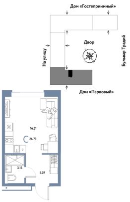 Продается 1комнатная квартира на 5 этаже от застройщика Страна Девелопмент. Площадь квартиры 24,73 кв. м.