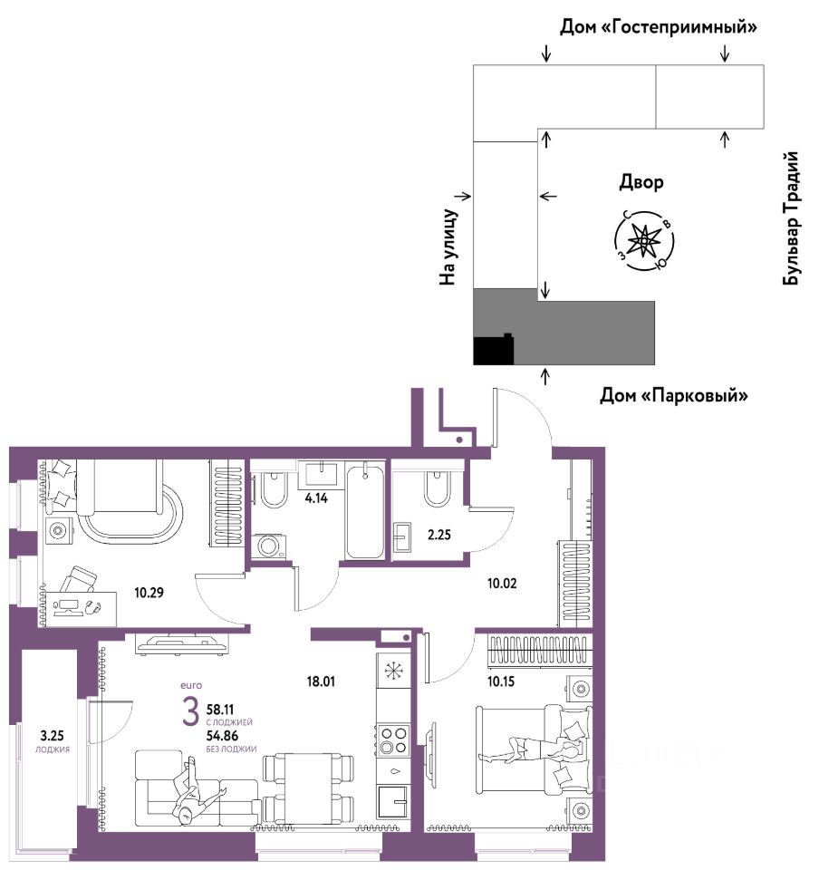 Продается 3комнатная квартира на 9 этаже от застройщика Страна Девелопмент. Площадь квартиры 58,11 кв. м.