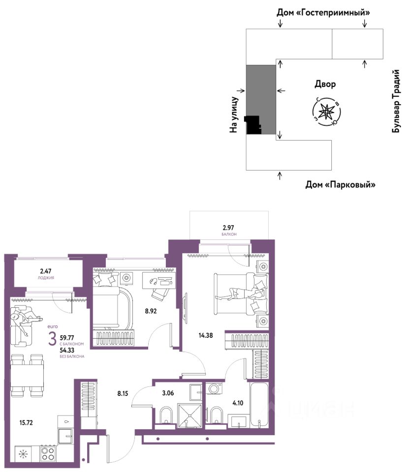 Продается 3комнатная квартира на 8 этаже от застройщика Страна Девелопмент. Площадь квартиры 59,77 кв. м.