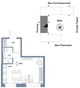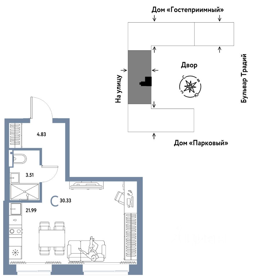 Продается 1комнатная квартира на 9 этаже от застройщика Страна Девелопмент. Площадь квартиры 30,33 кв. м.