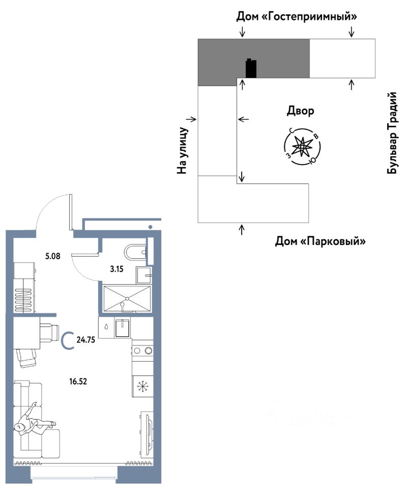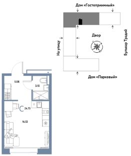 Продается 1комнатная квартира на 2 этаже от застройщика Страна Девелопмент. Площадь квартиры 24,75 кв. м.