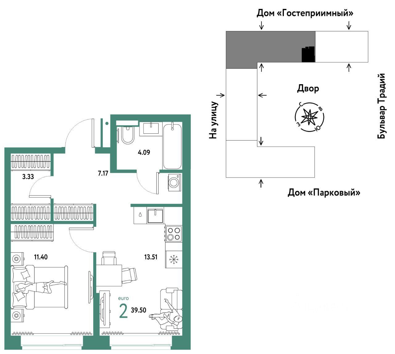 Продается 2комнатная квартира на 3 этаже от застройщика Страна Девелопмент. Площадь квартиры 39,5 кв. м.