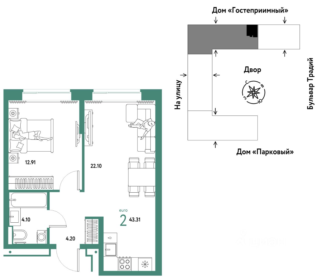 Продается 2комнатная квартира на 5 этаже от застройщика Страна Девелопмент. Площадь квартиры 43,31 кв. м.