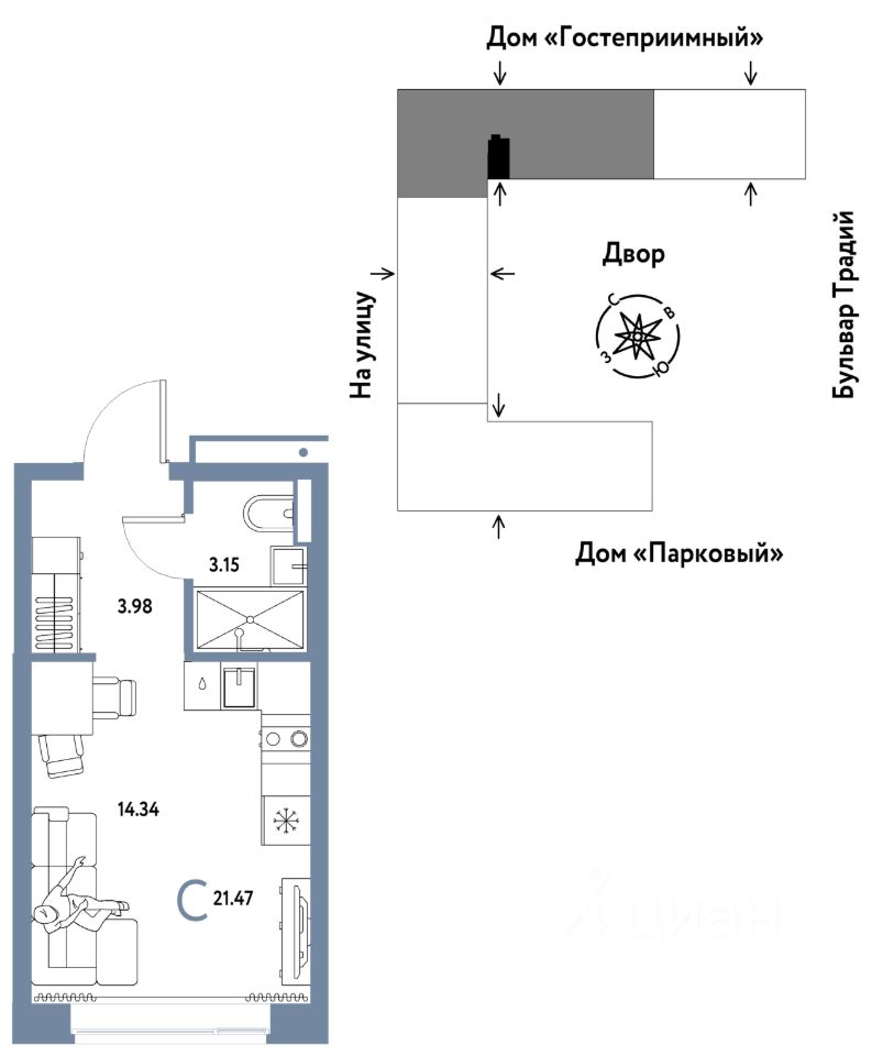 Продается 1комнатная квартира на 10 этаже от застройщика Страна Девелопмент. Площадь квартиры 21,47 кв. м.