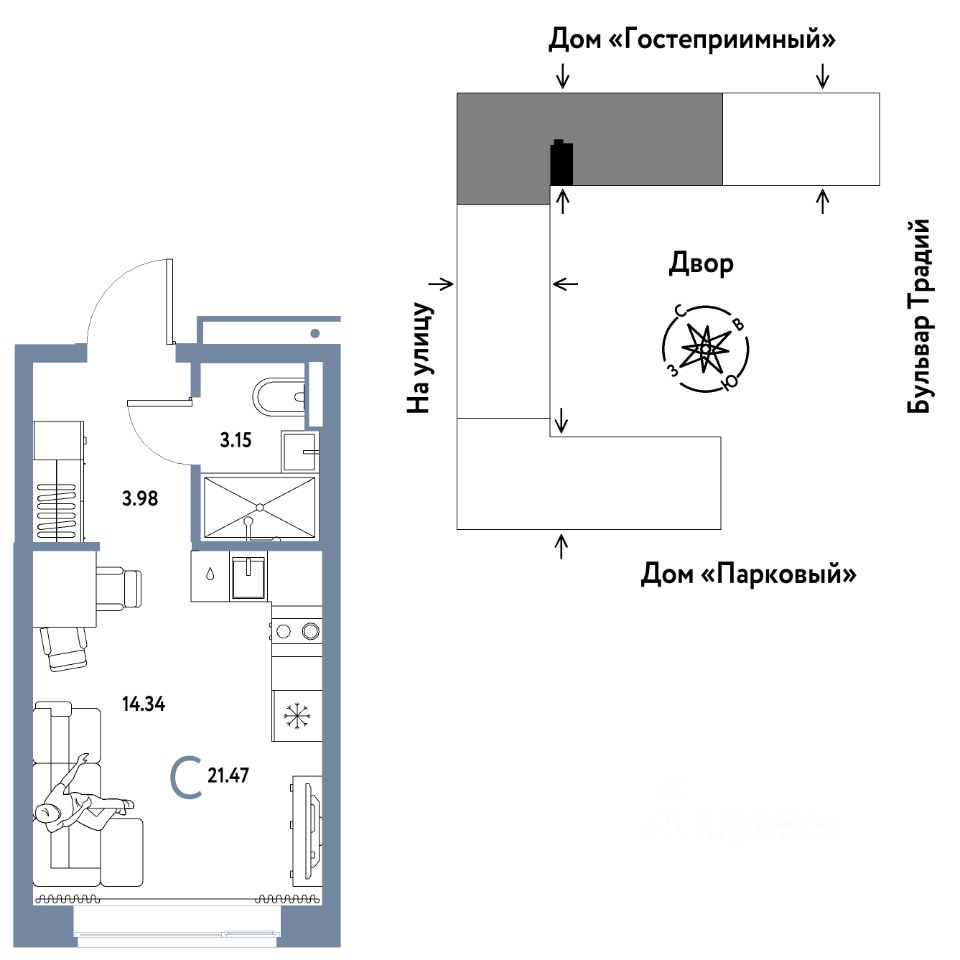 Продается 1комнатная квартира на 14 этаже от застройщика Страна Девелопмент. Площадь квартиры 21,47 кв. м.