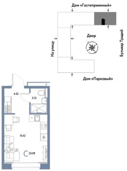 Продается 1комнатная квартира на 8 этаже от застройщика Страна Девелопмент. Площадь квартиры 23,09 кв. м.