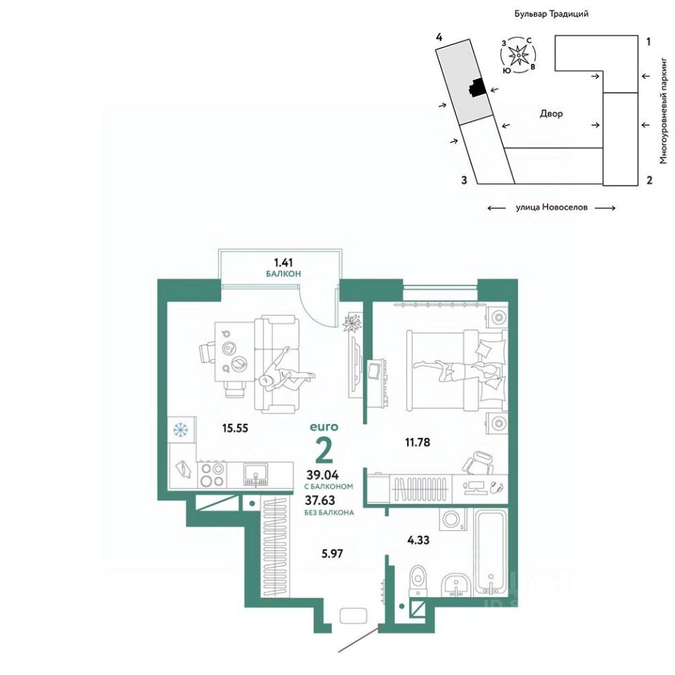 Продается 2комнатная квартира на 5 этаже от застройщика Страна Девелопмент. Площадь квартиры 39,04 кв. м.