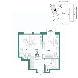 Продается 2комнатная квартира на 6 этаже от застройщика Страна Девелопмент. Площадь квартиры 38,49 кв. м.