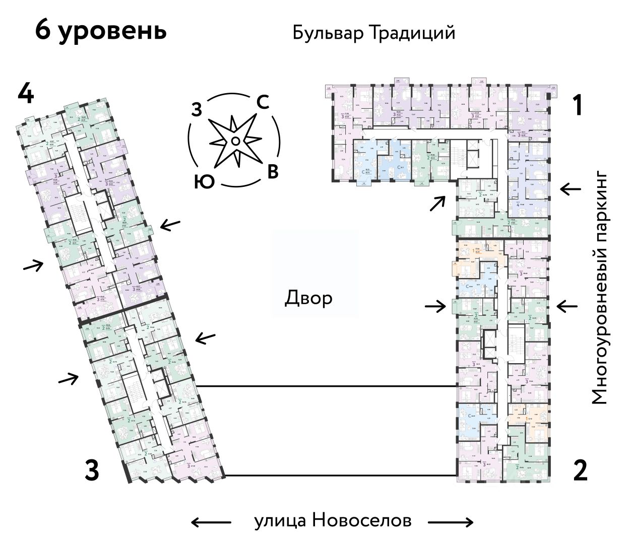 - Сквозные парадные с прозрачными входными группами, колясочными и велосипедными