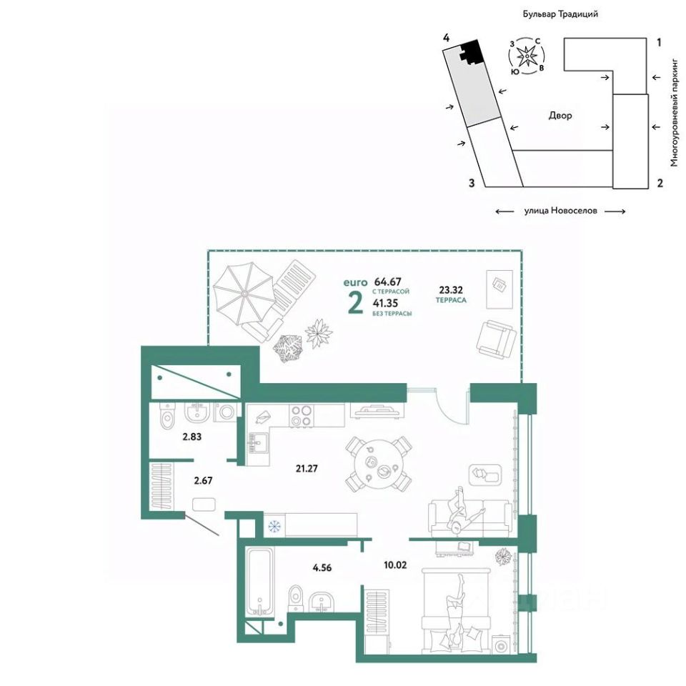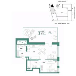 Продается 2комнатная квартира на 9 этаже от застройщика Страна Девелопмент. Площадь квартиры 64,67 кв. м.