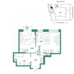 Продается 2комнатная квартира на 9 этаже от застройщика Страна Девелопмент. Площадь квартиры 40,21 кв. м.