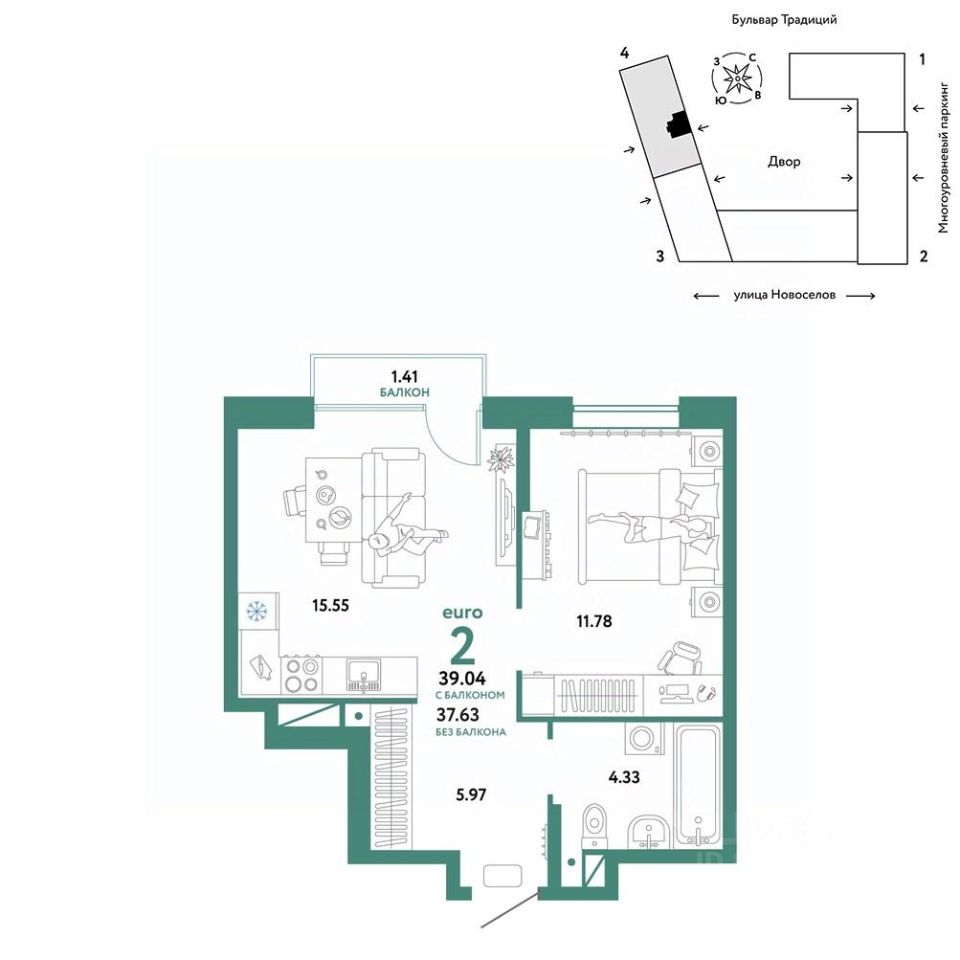 Продается 2комнатная квартира на 9 этаже от застройщика Страна Девелопмент. Площадь квартиры 39,04 кв. м.
