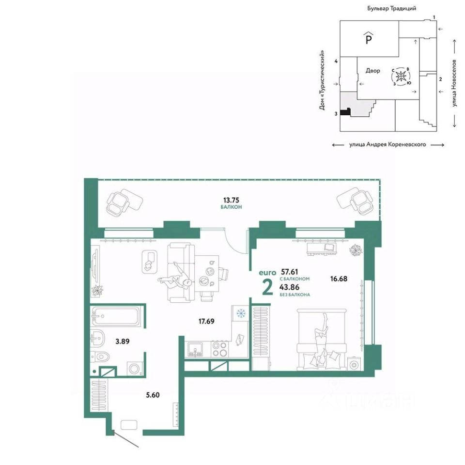Продается 2комнатная квартира в новом микрорайоне "Домашний" в районе Московского тракта рядом с ТРЦ "Колумб". Общая площадь квартиры 57,61 кв. м. Сдача — в 4 квартале 2024 года.