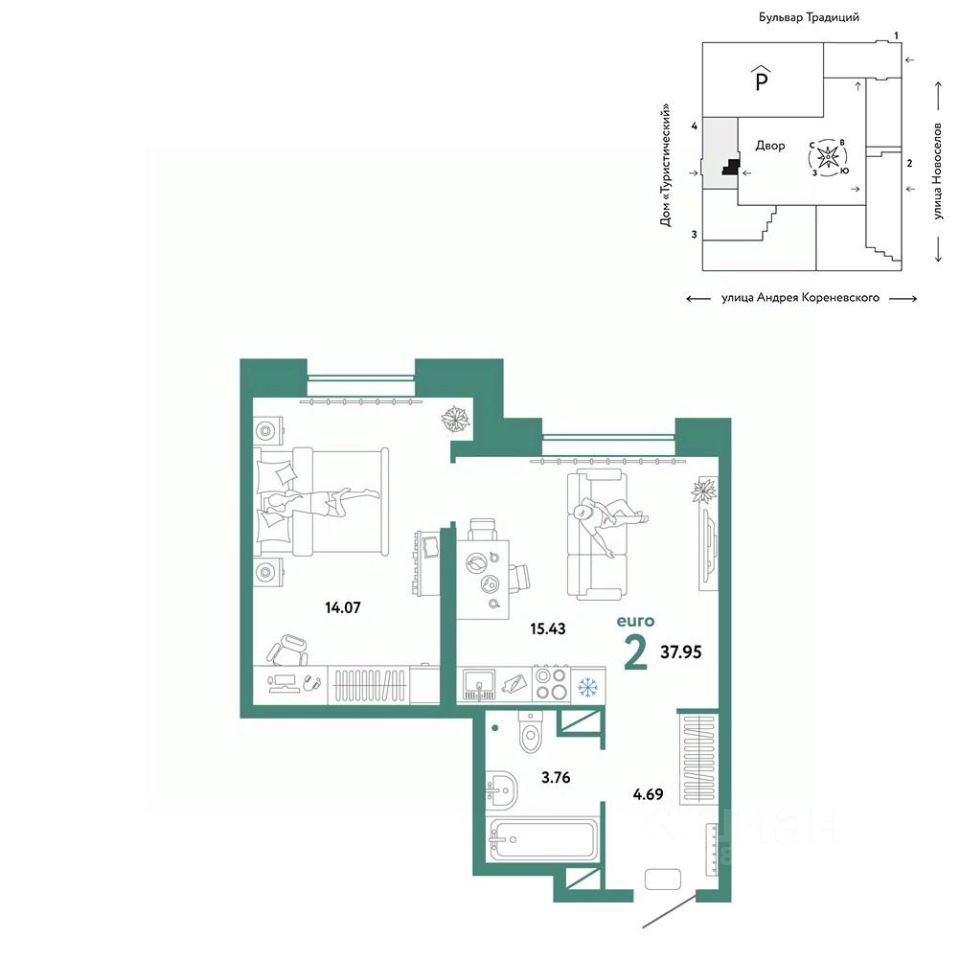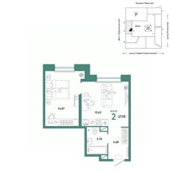 Продается 2комнатная квартира в новом микрорайоне "Домашний" в районе Московского тракта рядом с ТРЦ "Колумб". Общая площадь квартиры 37,95 кв. м. Сдача — в 4 квартале 2024 года.