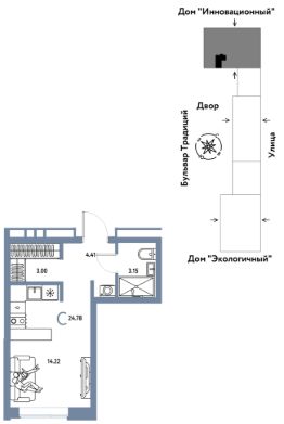Продается 1комнатная квартира на 5 этаже от застройщика Страна Девелопмент. Площадь квартиры 24,78 кв. м.