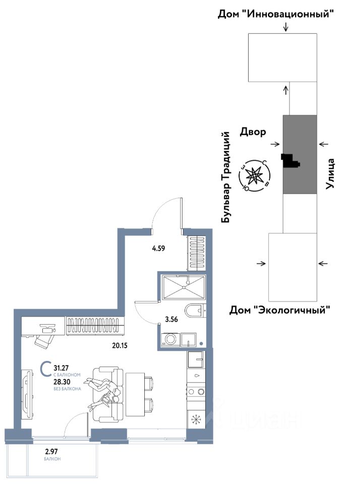 Продается 1комнатная квартира на 5 этаже от застройщика Страна Девелопмент. Площадь квартиры 31,27 кв. м.