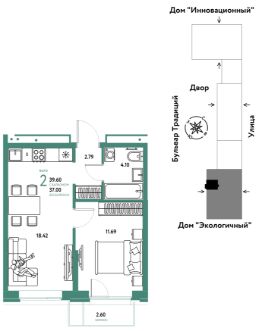 Продается 2комнатная квартира на 2 этаже от застройщика Страна Девелопмент. Площадь квартиры 39,6 кв. м.