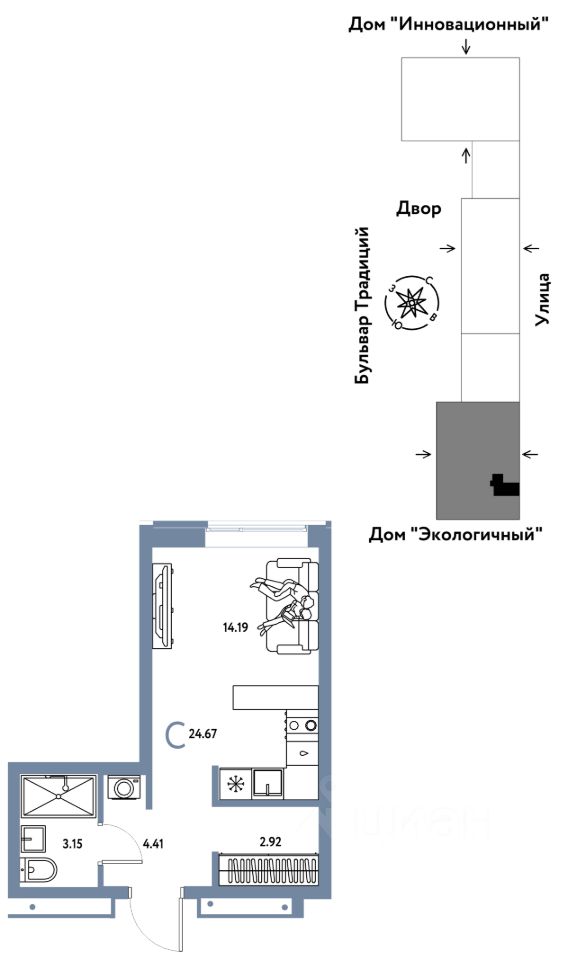 Продается 1комнатная квартира на 3 этаже от застройщика Страна Девелопмент. Площадь квартиры 24,67 кв. м.