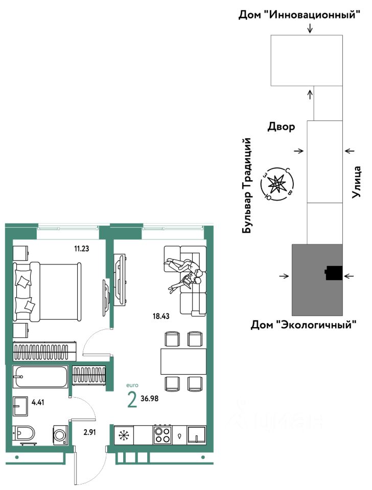 Продается 2комнатная квартира на 6 этаже от застройщика Страна Девелопмент. Площадь квартиры 36,98 кв. м.