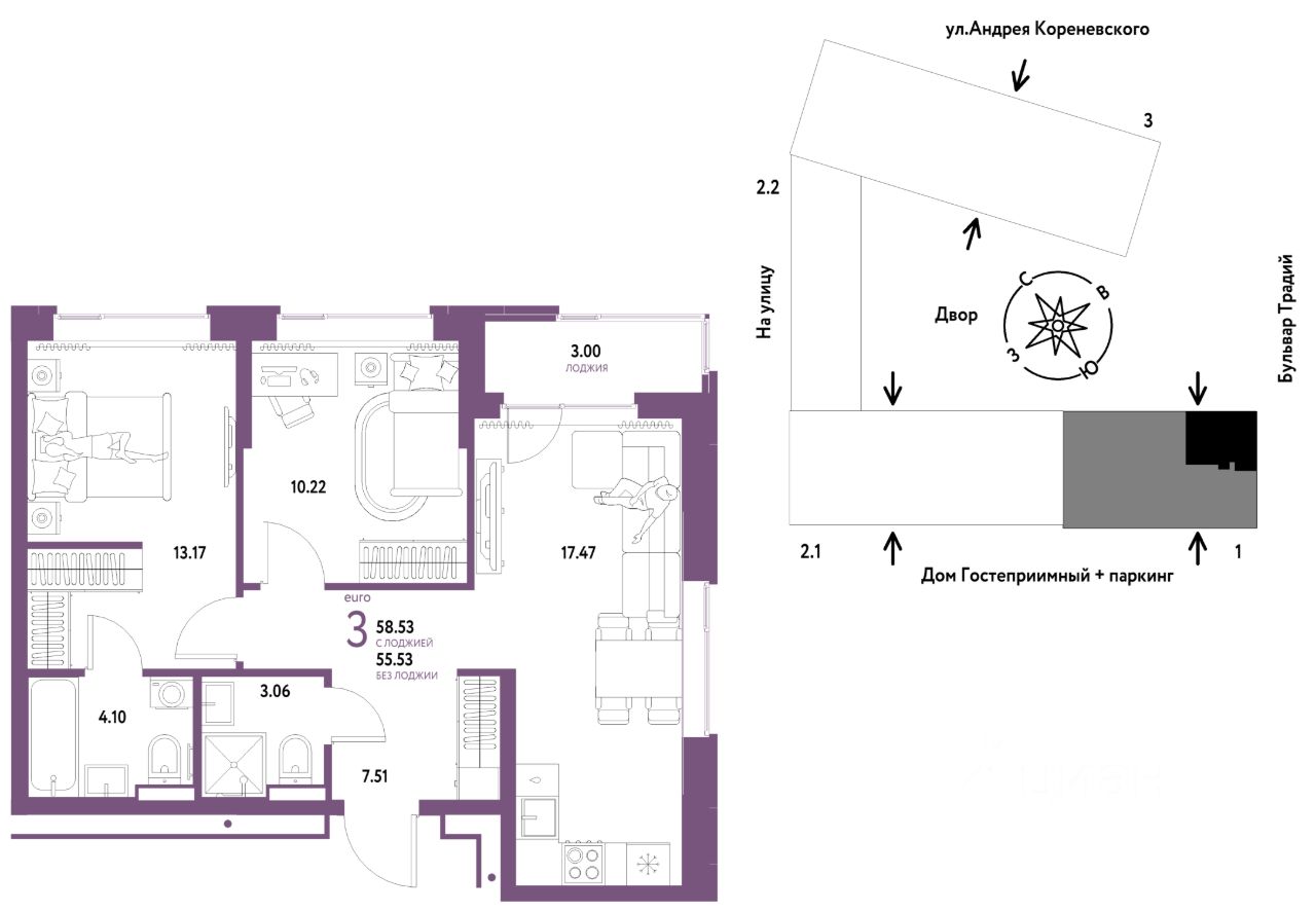 Продается 3комнатная квартира на 2 этаже от застройщика Страна Девелопмент. Площадь квартиры 58,53 кв. м.