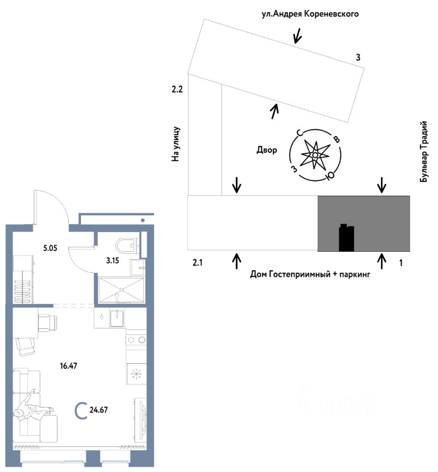 Продается 1комнатная квартира на 10 этаже от застройщика Страна Девелопмент. Площадь квартиры 24,67 кв. м.