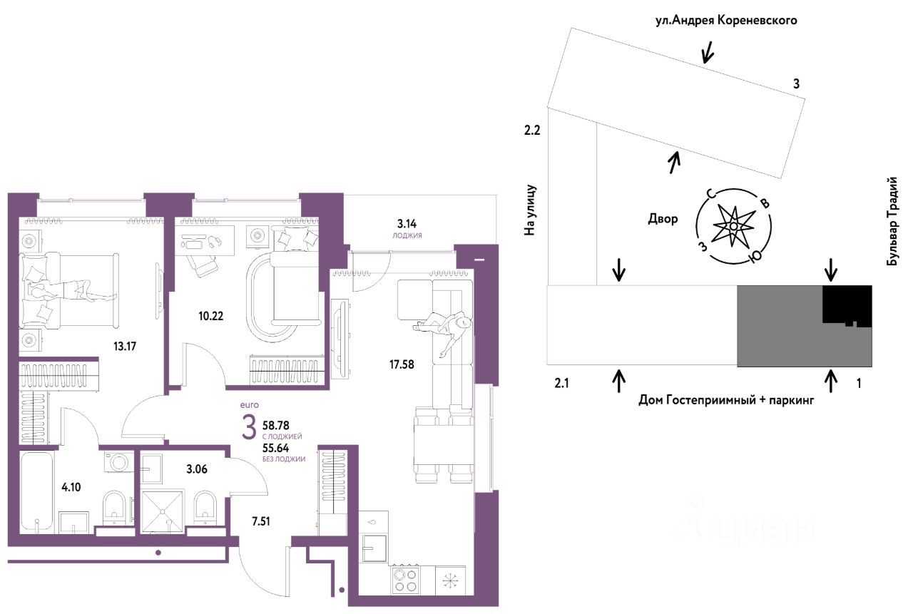 Продается 3комнатная квартира на 11 этаже от застройщика Страна Девелопмент. Площадь квартиры 58,78 кв. м.