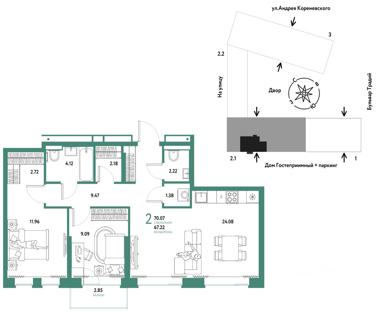 Продается 3комнатная квартира на 6 этаже от застройщика Страна Девелопмент. Площадь квартиры 70,07 кв. м.