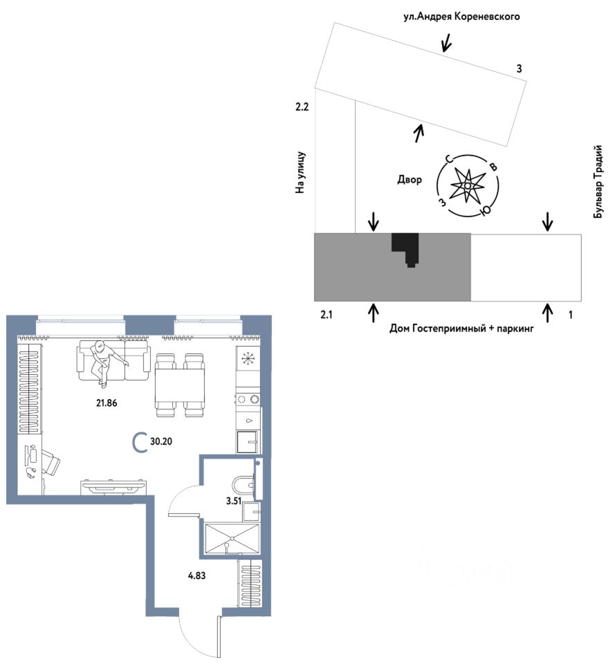 Продается 1комнатная квартира на 7 этаже от застройщика Страна Девелопмент. Площадь квартиры 30,2 кв. м.