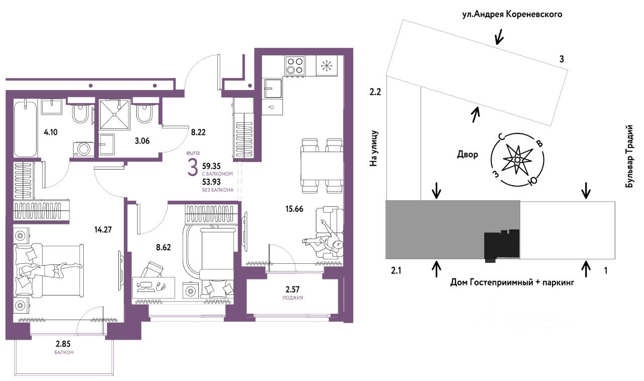 Продается 3комнатная квартира на 10 этаже от застройщика Страна Девелопмент. Площадь квартиры 59,35 кв. м.