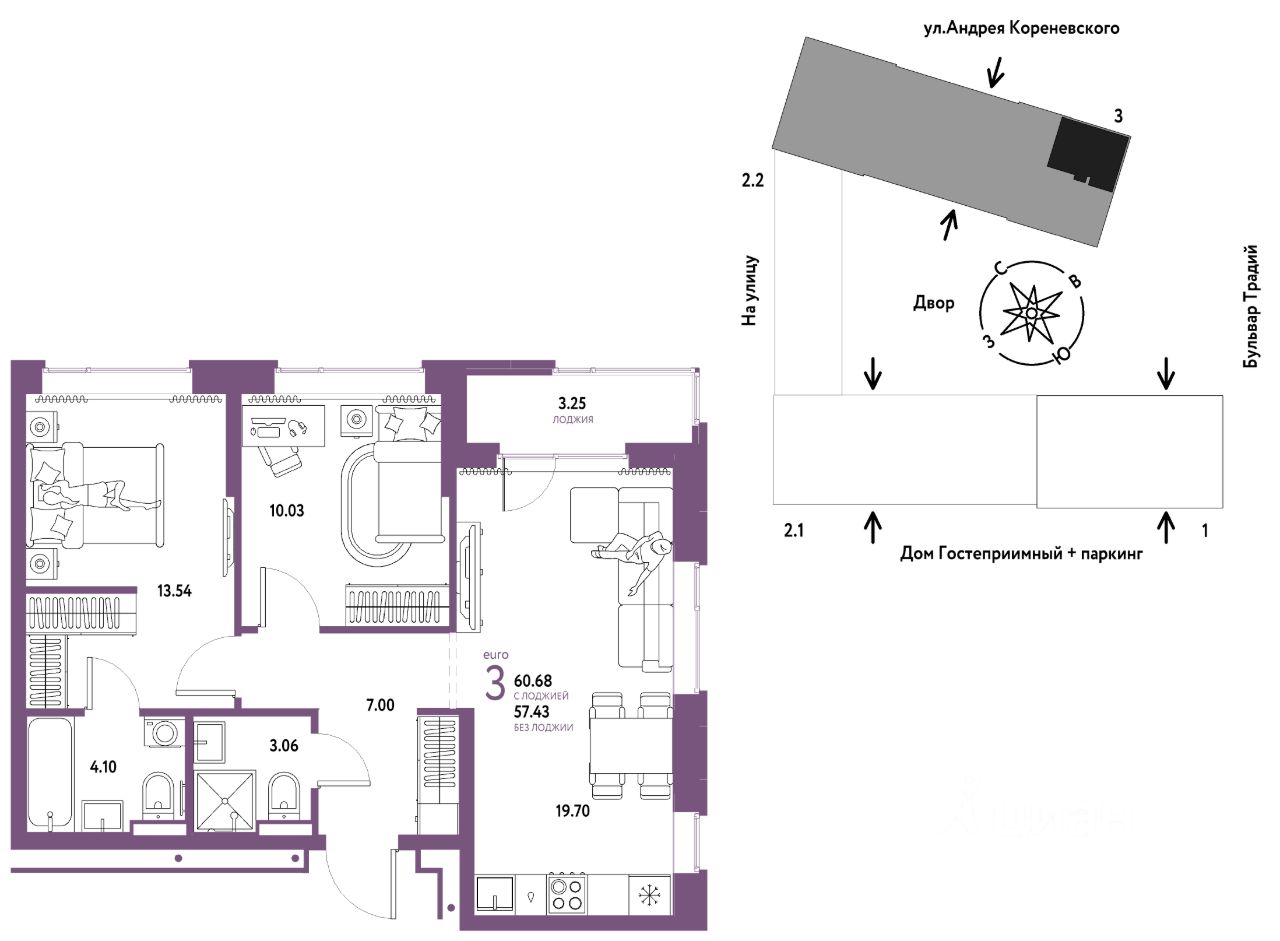 Продается 3комнатная квартира на 2 этаже от застройщика Страна Девелопмент. Площадь квартиры 60,68 кв. м.