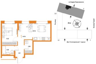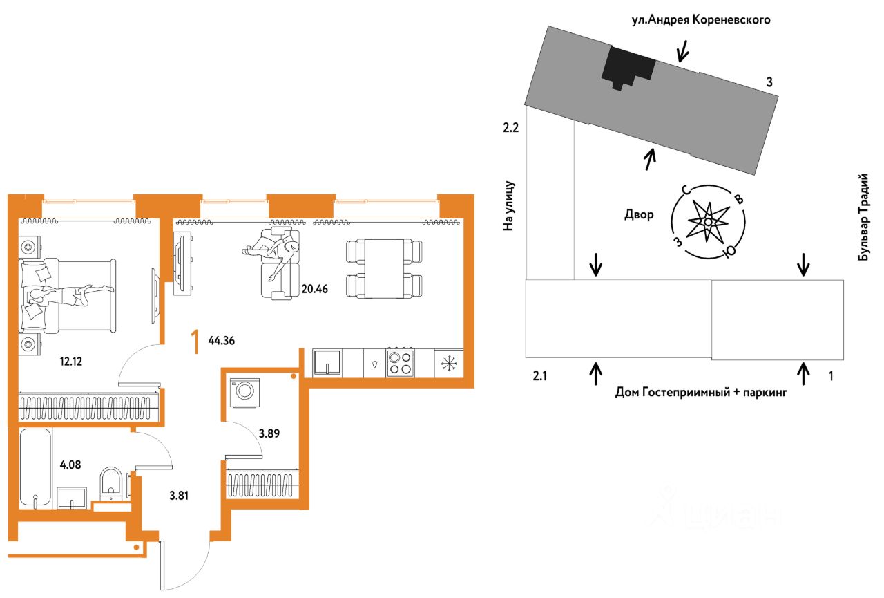 Продается 1комнатная квартира на 9 этаже от застройщика Страна Девелопмент. Площадь квартиры 44,36 кв. м.