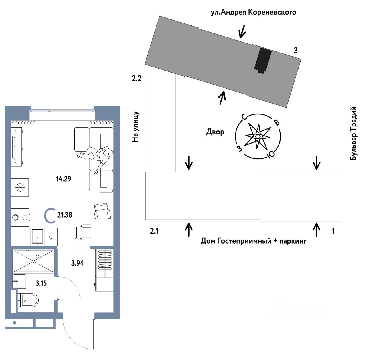 Продается 1комнатная квартира на 12 этаже от застройщика Страна Девелопмент. Площадь квартиры 21,38 кв. м.