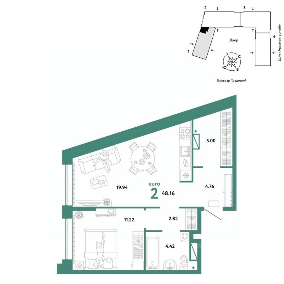 Продается 2комнатная квартира на 4 этаже от застройщика Страна Девелопмент. Площадь квартиры 48,16 кв. м.