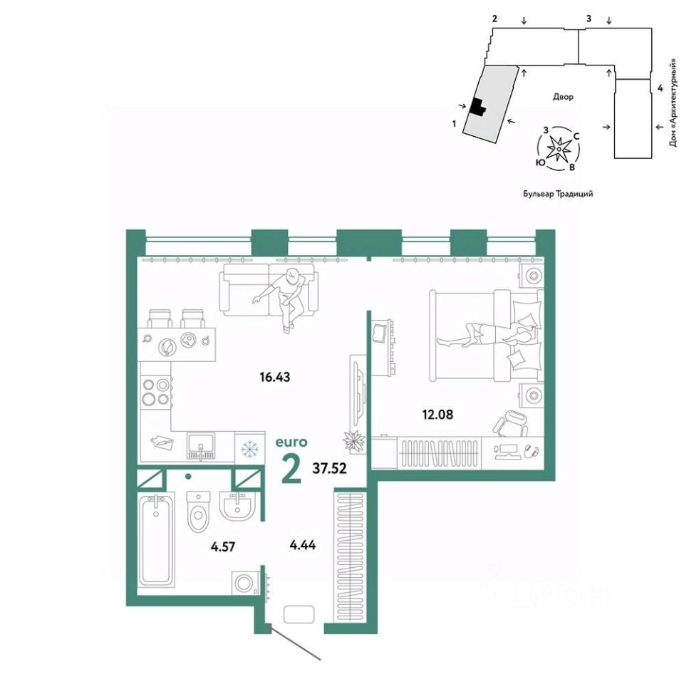 Продается 2комнатная квартира на 5 этаже от застройщика Страна Девелопмент. Площадь квартиры 37,52 кв. м.