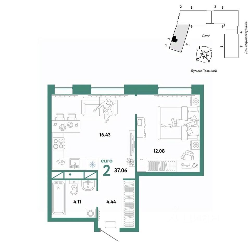 Продается 2комнатная квартира на 8 этаже от застройщика Страна Девелопмент. Площадь квартиры 37,06 кв. м.