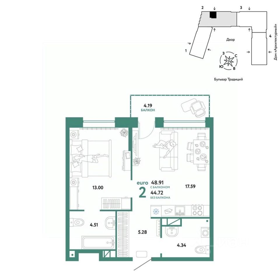 Продается 2комнатная квартира на 3 этаже от застройщика Страна Девелопмент. Площадь квартиры 48,91 кв. м.