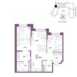 Продается 3комнатная квартира на 9 этаже от застройщика Страна Девелопмент. Площадь квартиры 69,33 кв. м.
