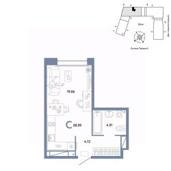 Продается 1комнатная квартира на 12 этаже от застройщика Страна Девелопмент. Площадь квартиры 28,09 кв. м.